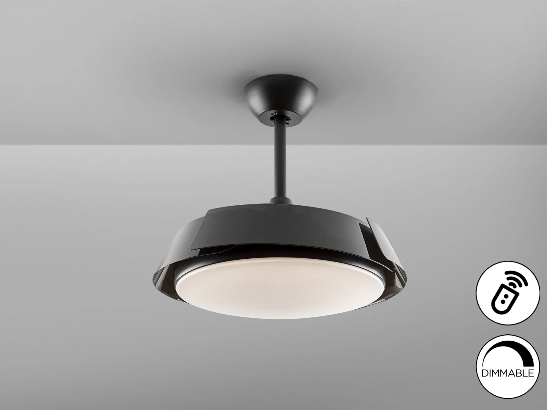 Стилен таванен вентилатор ENZO с регулируемо LED осветление и елегантно черно покритие. С 4 сгъваеми лопатки и иновативен DC мотор, той предлага 6 скорости и обратна функция.