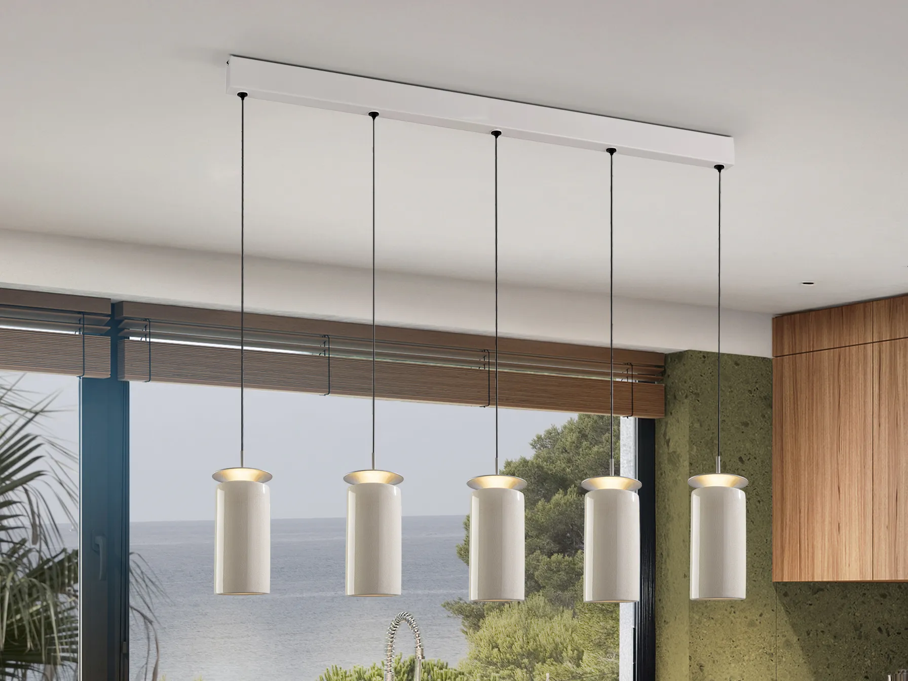 – **Пет керамични абажура** в кремав цвят с пукнатини, които придават уникален вид;
