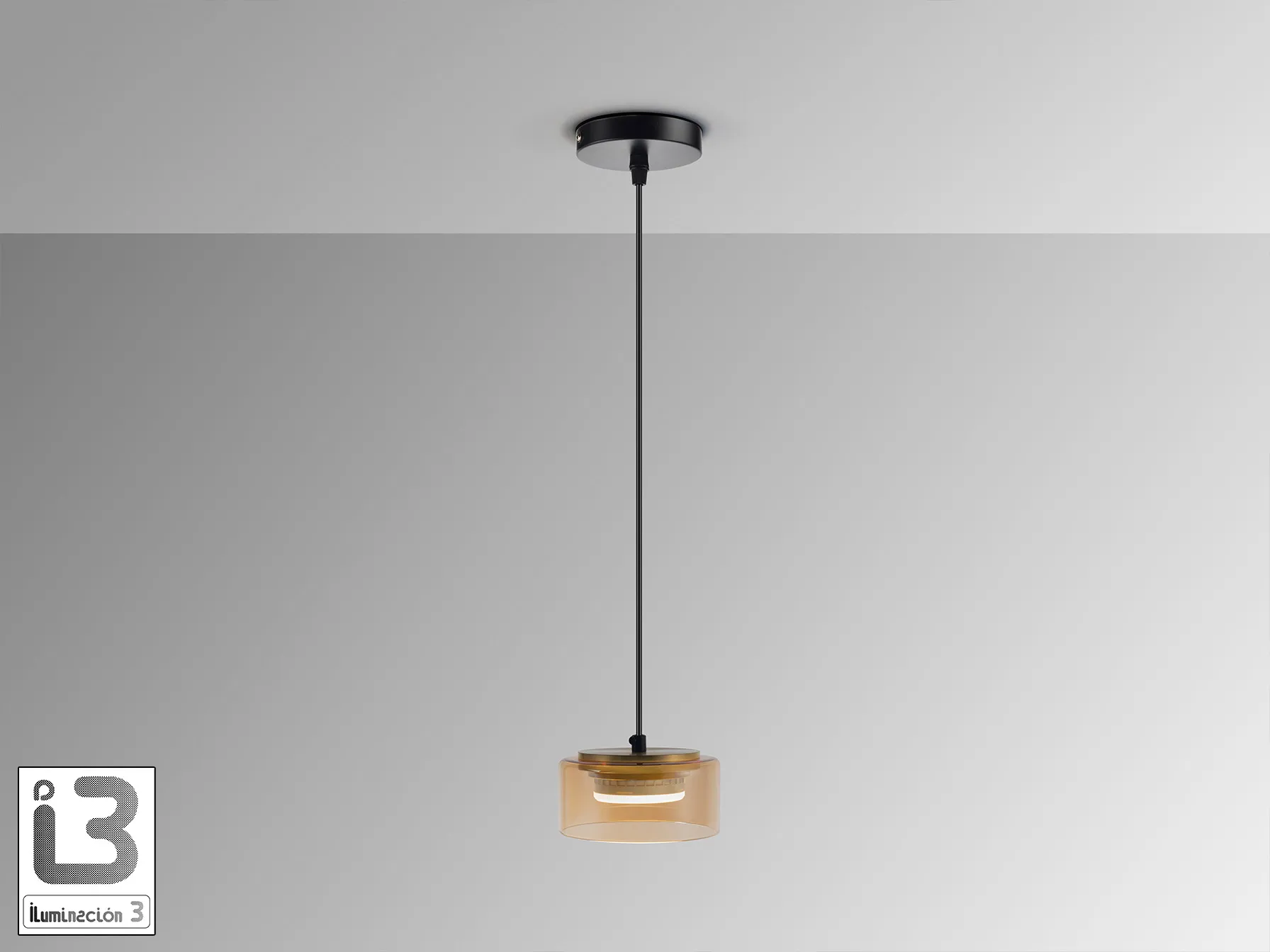 Тази елегантна лампа от серията Olaia съчетава метално покритие в матово черно и злато с янтарен стъклен абажур. Регулируема по височина, тя е идеален избор за всяко съвременно пространство.