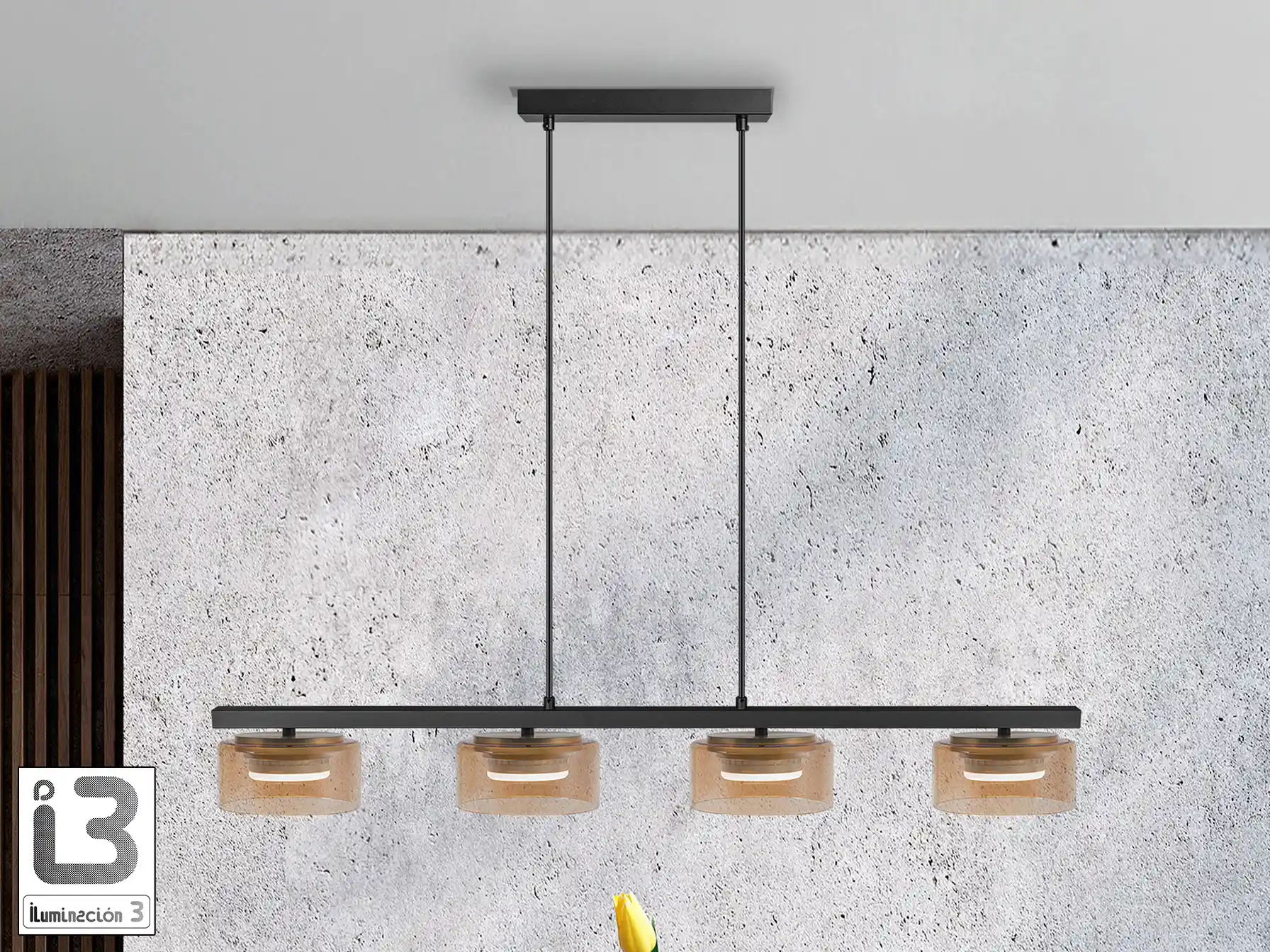 Лампата Olaia I3 съчетава елегантен черен матов метал с амбър стъклени абажури. С 4 лампи с мощност 6W, тя осигурява уютно осветление с цветна температура 3000K.