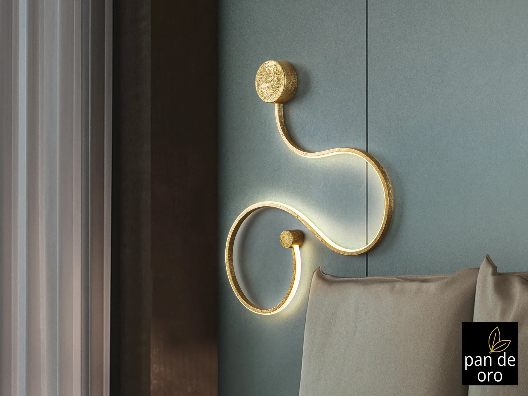 Настенната лампа GRAFOS в златен лист е изработена от стомана и алуминий, с опален силиконов дифузьор. С LED осветление от 19,5 W и 900 лумена, тя съчетава стил и функционалност.